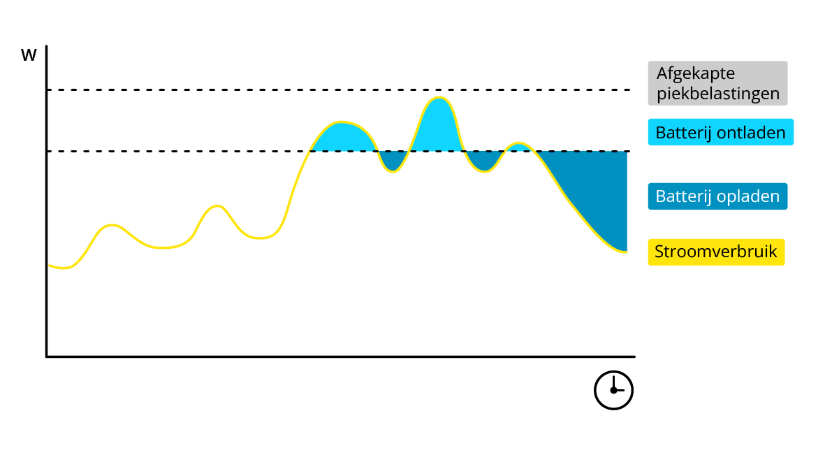 Telkens wanneer machines met een hoog vermogen worden ingeschakeld, kan de afname boven het gecontracteerd vermogen komen. Dit kan voorkomen worden door gebruik te maken van peak shaving. Het deel aan stroombehoefte dat boven het gecontracteerd vermogen komt, wordt dan uit de batterij gehaald.