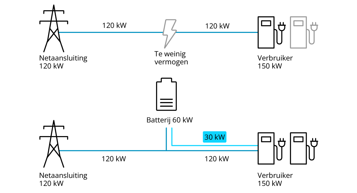 Een normaal netvermogen is niet voldoende om elektrische laadstations te laten werken, de productiecapaciteit uit te breiden of een bedrijf te vergroten. Een commerciële batterij levert het benodigde vermogen zonder dat er duur extra netvermogen hoeft te worden aangeschaft.