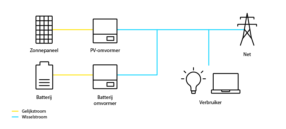 De meeste elektrische apparaten werken op gelijkstroom. Zonnepanelen wekken altijd gelijkstroom op. Daarom moet elk opslagsysteem een omvormer bevatten die wisselstroom omzet in bruikbare gelijkstroom.
