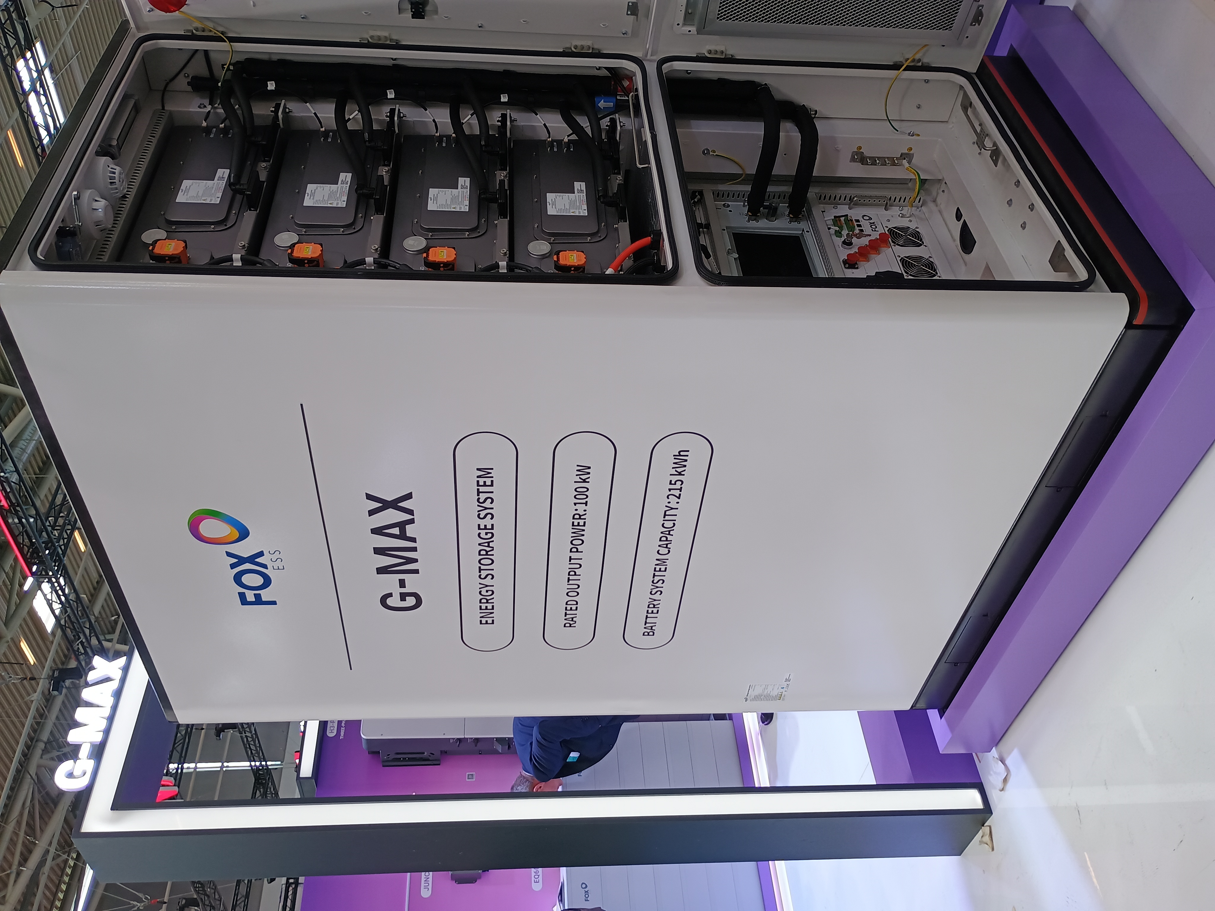 - Fox ESS G-Max All In One: Het krachtige, vloeistofgekoelde commerciële opslagsysteem (215 kWh / 100 kW uitgangsvermogen) is het paradepaardje van C&I op Intersolar 2025. Het systeem is vooraf geconfigureerd en de modules en koelsystemen zijn al voor gemonteerd. Het enige wat je hoeft te doen is de AC aan te sluiten en het opslagsysteem in bedrijf te stellen via het EMS.